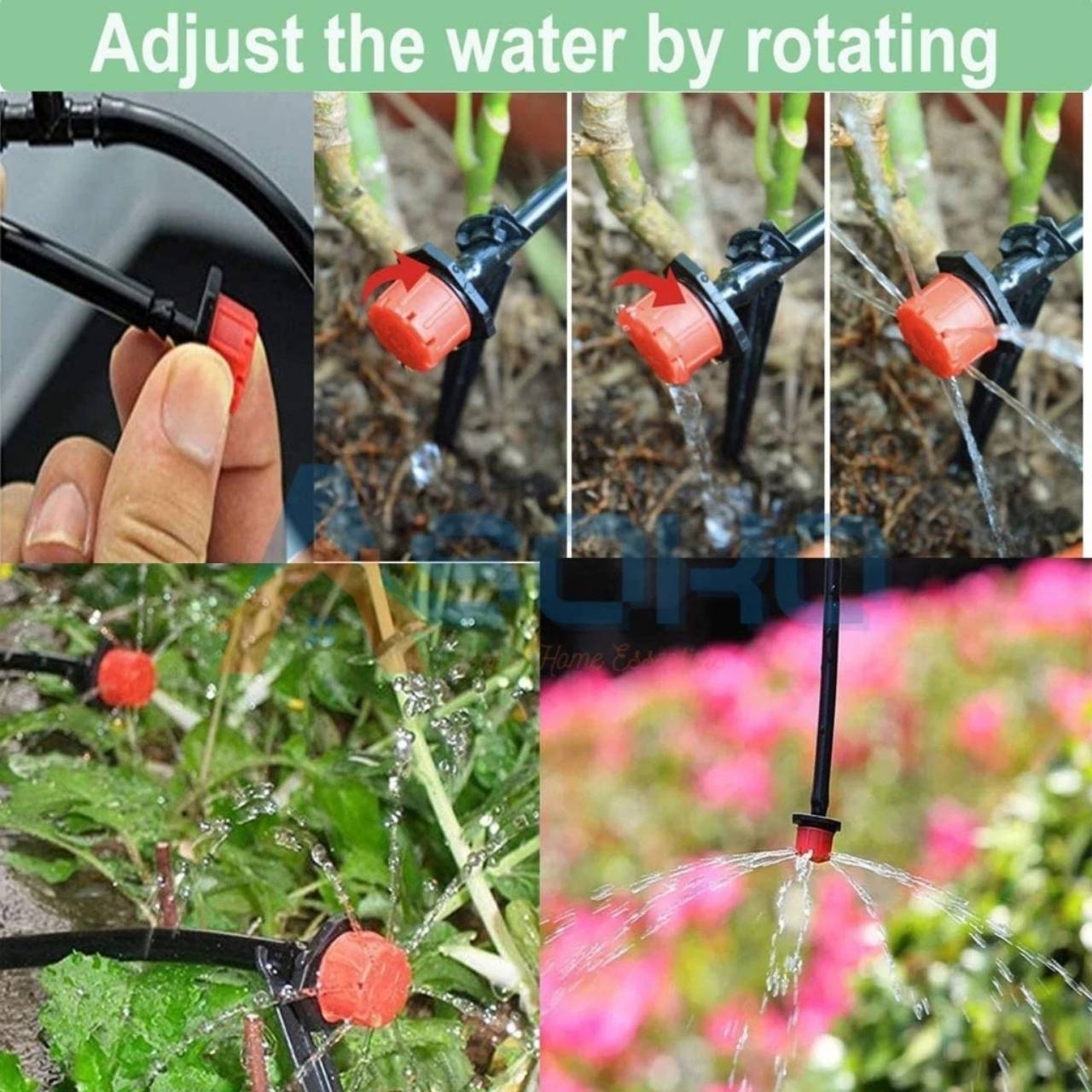 Το σετ περιλαμβάνει ψεκαστικά που μπορείτε εύκολα να εγκαταστήσετε απευθείας στον σωλήνα. Δημιουργήστε ένα άνοιγμα στον σωλήνα στο επιθυμητό σημείο πιέζοντας και εισάγετε σταθερά κάθε ψεκαστικό ώστε να καθίσει ασφαλώς στη θέση του. Το ψεκαστικό διαθέτει περιστρεφόμενη κεφαλή που επιτρέπει την πλήρη ρύθμιση της ροής - με την περιστροφή, μπορείτε να ρυθμίσετε την ποσότητα νερού που λαμβάνει κάθε φυτό. Τα ψεκαστικά διαθέτουν επίσης σύστημα αυτοκαθαρισμού που αποτρέπει τους φραγμούς και 8 μικρά ανοίγματα που εξασφαλίζουν ομοιόμορφη κατανομή νερού. Το σύστημα είναι κατάλληλο για χρήση στον κήπο, σε θερμοκήπια, σε φάρμες, για παρτέρια ή φυτά σε γλάστρες. Μπορεί να χρησιμοποιηθεί για σπορόφυτα, λαχανικά, φρούτα και καλλωπιστικά φυτά. Εάν χρειαστεί, απλά απενεργοποιήστε το σύστημα ή επανενεργοποιήστε το περιστρέφοντας το ακροφύσιο πλήρως προς τη μία ή την άλλη κατεύθυνση. Για βέλτιστη λειτουργία του συστήματος, εξασφαλίστε επαρκή πίεση νερού και ελέγχετε τακτικά ότι τα ανοίγματα δεν είναι φραγμένα με σωματίδια εδάφους.